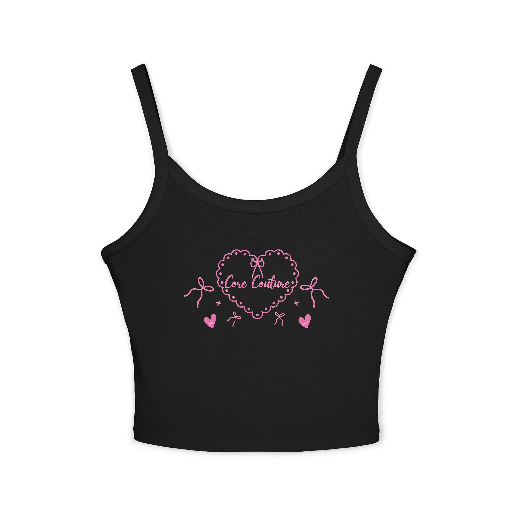 The “Core Couture” crop top is made for the girly girls who lift, pulse, plank, and always serve a look. Designed with a dainty heart, ribbon bows, and balletcore energy, this soft cami tank adds the perfect flirty flair to your hot Pilates, yoga, or barre fit.